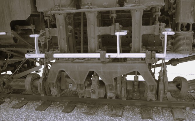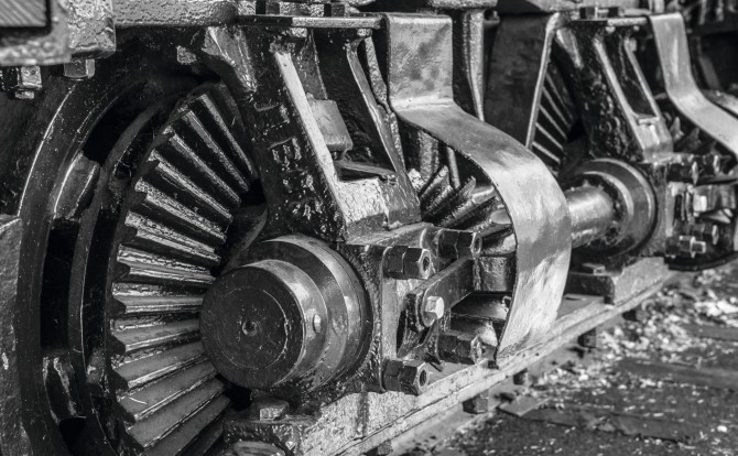 Bild oben: Nahaufnahme des Stirnradgetriebes an einem der Radsätze. Copyright: Steven Fine (Wikimedia Commons)